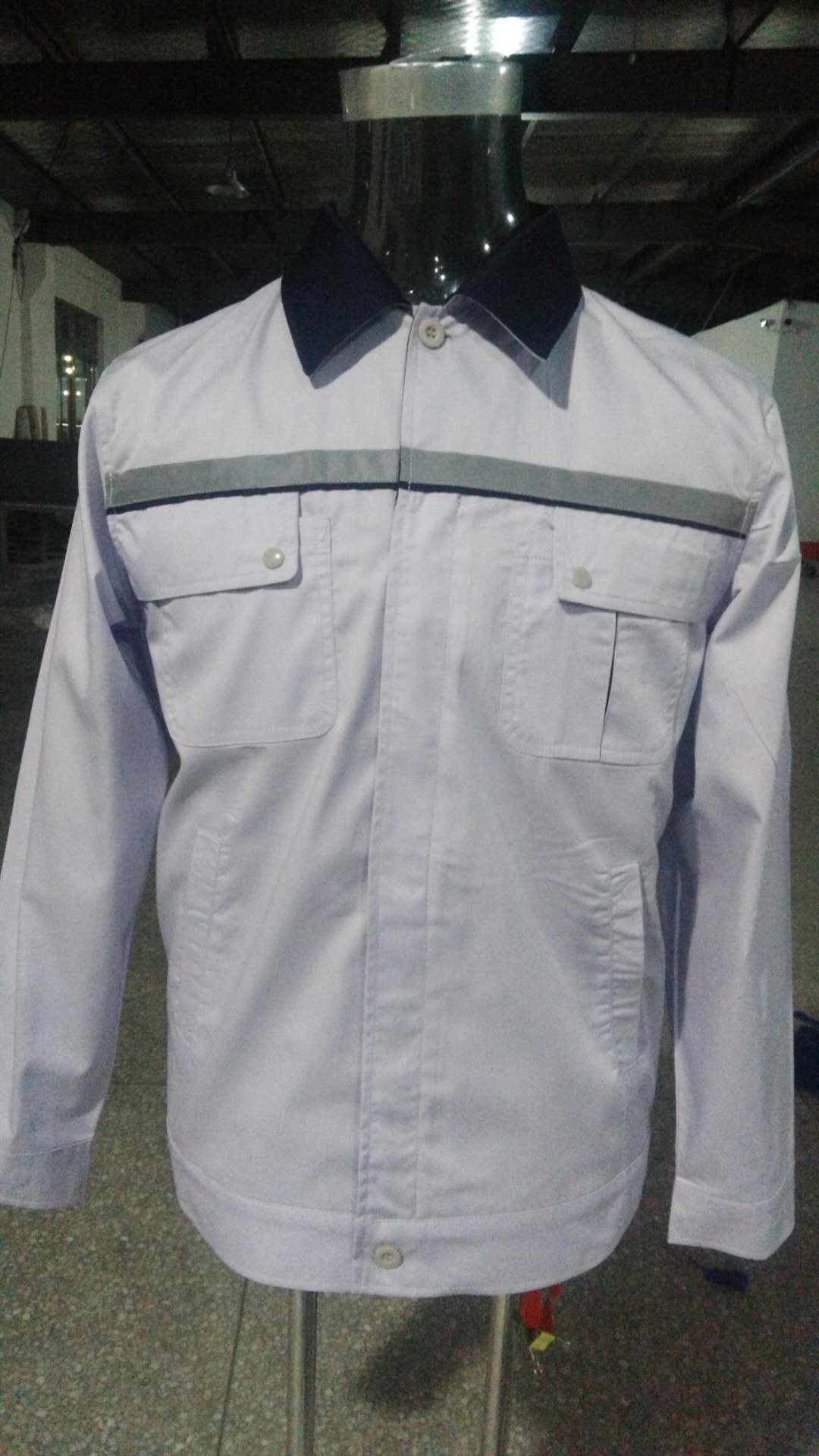 河北长征汽车是一家汽车制造公司。内有员工叁佰多人。每年夏季都要开始定做夏季工作服。夏季工作服分为两种,短袖和长袖。夏季长袖工作服的款式和短袖保持一致。只是袖子长度的区别。目前款式已经确定,产前样已经出品。采用了非常浅的灰色面料拼藏青色的款式。款式图片如下: