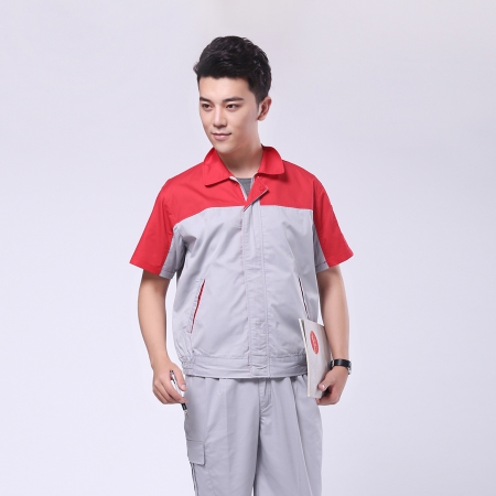 苏州鹰诺服装:大红配浅灰全棉工作服AD078-QM