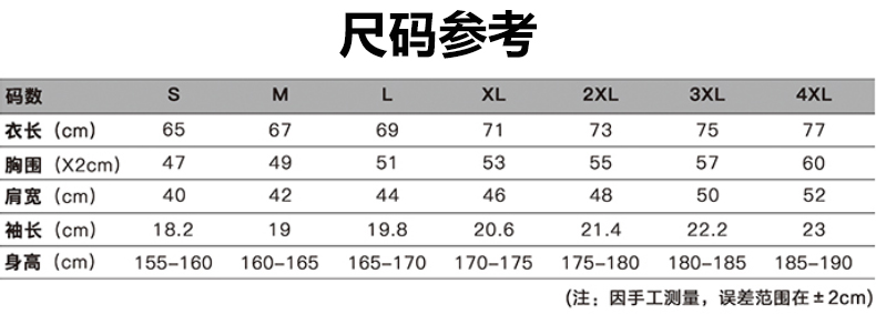 本产品共8个尺码:XS、S、M、L、XL、2XL、3XL、4XL 覆盖99.5%的人群。查看尺码表>