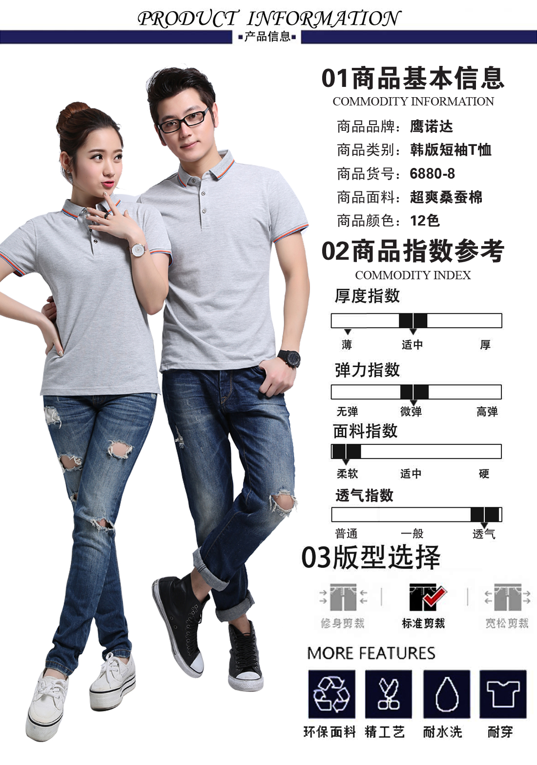 - 游客于 2018-04-16 09:44:07 发表苏州鹰诺服装:花灰超爽桑蚕棉t恤衫工作服ID6880-8