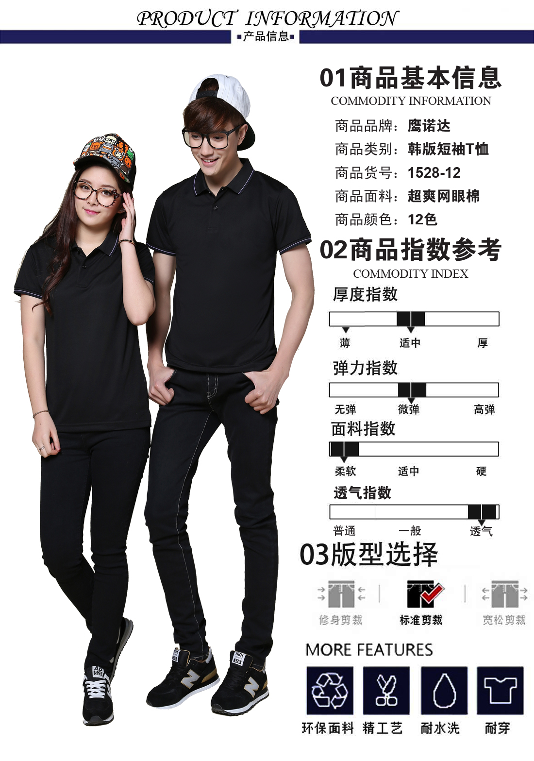 - 游客于 2017-06-19 14:45:52 发表苏州鹰诺服装:黑色提花翻领超爽网眼棉T恤衫ID1528-12